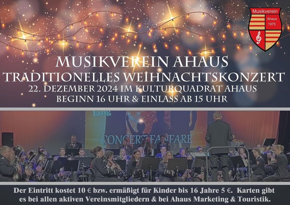 Nur noch knapp fünf Wochen und unser traditionelles Weihnachtskonzert findet wieder in der Ahauser Stadthalle (Kulturquadrat) statt. Karten gibt es ab heute, wie in den letzten Jahren üblich, bei allen Musikern des Vereins, sowie auch beim Ahaus Marketing & Touristik.
